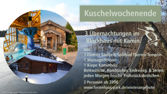 im Kamin prasselt ein angenehm wärmendes Feuerchen, im DVD Player dreht sich leichte Kost aus unserer Videothek und in deinem Arm kuschelt dein Lieblingsmensch. 3 Nächte nur für euch, bei uns. Absolute Ruhe, entspannende Natur, winterliche Seen und Wälder und als Höhepunkt ein Ausflug in die Naturtherme Templin inkl. Nutzung der Saunawelt und einer Massage.